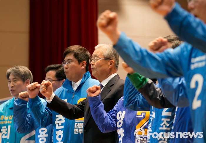 (광주=포커스뉴스) 김종인(왼쪽 네번째) 더불어민주당 비대위 대표가 27일 오전 광주 서구 김대중컨벤션센터에서 더불어민주당 경제살리기 광주·전남 20대 총선 후보자 연석회의를 마친 뒤 후보들과 함께 파이팅을 외치고 있다.