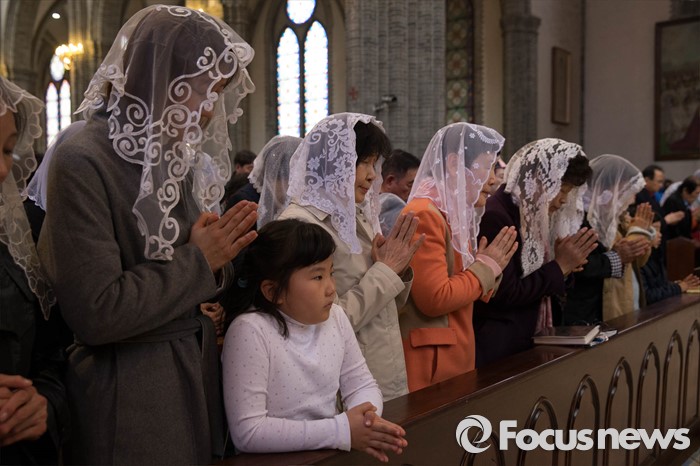 (서울=포커스뉴스) 부활절을 맞아 27일 정오 서울 중구 명동성당에서 열린 '예수 부활 대축일 미사'에 신도들이 참석해 기도하고 있다.