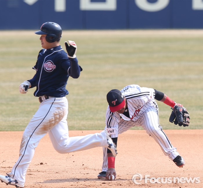 (서울=포커스뉴스) 27일 서울 잠실구장에서 열린 2016프로야구 시범경기 두산-LG 경기에서 LG 3루수 히메네스가 7회 두산 오재원의 타구를 잡고 있다. 주자는 두산 민병헌.