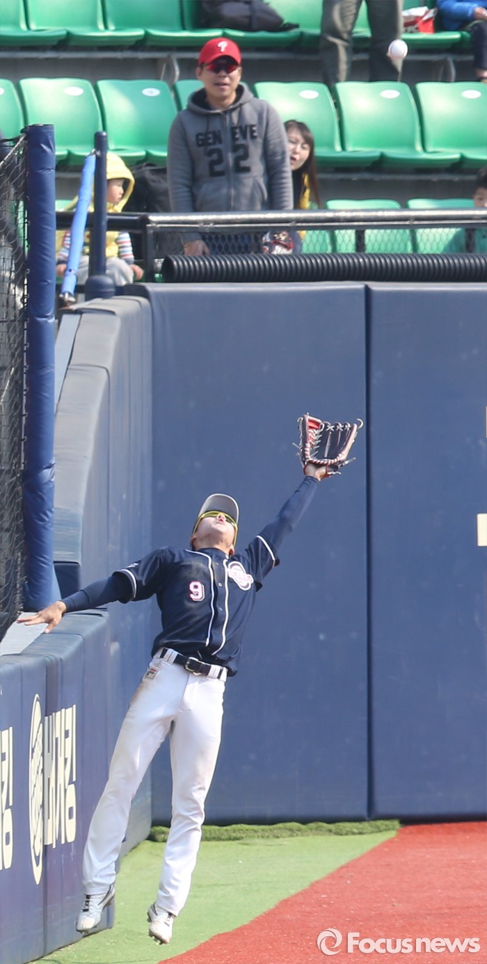 (서울=포커스뉴스) 27일 서울 잠실구장에서 열린 2016프로야구 시범경기 두산-LG 경기에서 8회말 두산 좌익수 조수행이 LG 이병규의 파울 타구를 펜스에 붙어서 잡아내고 있다.