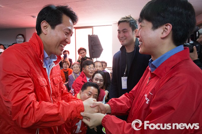 (서울=포커스뉴스) 이준석 새누리당 서울 노원병 후보가 27일 오후 서울 노원구 자신의 선거사무소 개소식에서 오세훈 후보와 악수를 하고 있다.
