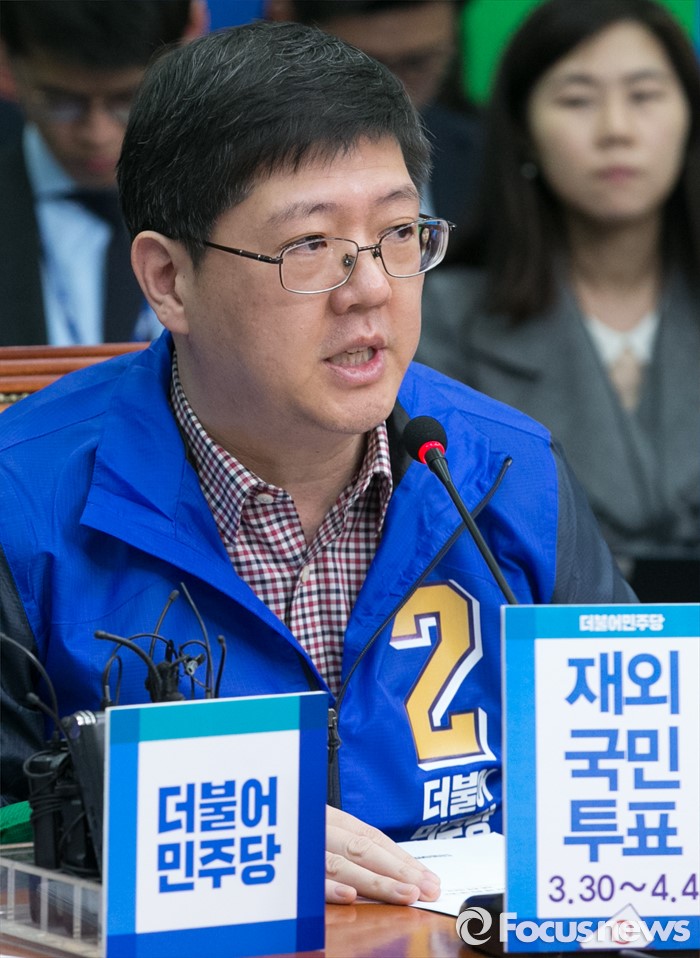 (서울=포커스뉴스) 김홍걸 더불어민주당 선대위 부위원장이 27일 오전 서울 여의도 국회에서 열린 중앙선거대책위원장단회의에 참석해 발언하고 있다.