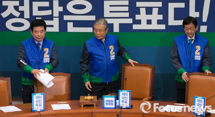 (서울=포커스뉴스) 김종인(가운데) 더불어민주당 비대위 대표 겸 선대위원장과 김진표(왼쪽), 진영 부위원장이 27일 오전 서울 여의도 국회에서 중앙선거대책위원장단회의에 참석하고 있다.