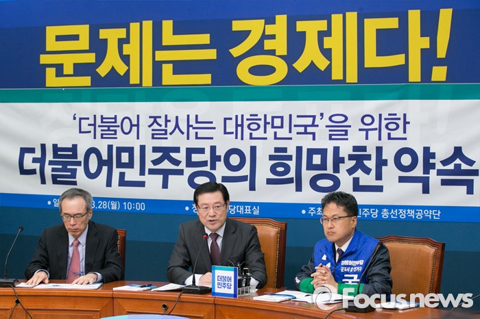 (서울=포커스뉴스) 이용섭(가운데) 더불어민주당 총선공약단장이 28일 오전 서울 여의도 국회에서 총선 정책공약집을 발표하고 있다.