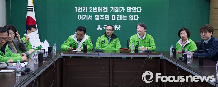 (서울=포커스뉴스) 안철수 국민의당 상임공동대표와 선거대책위원들이 28일 오전 서울 마포구 당사에서 선거대책위원회의를 열고 있다. 오른쪽 세번째부터 안 대표, 오세정 공동선거대책위원장, 김영환 선거대책위원장