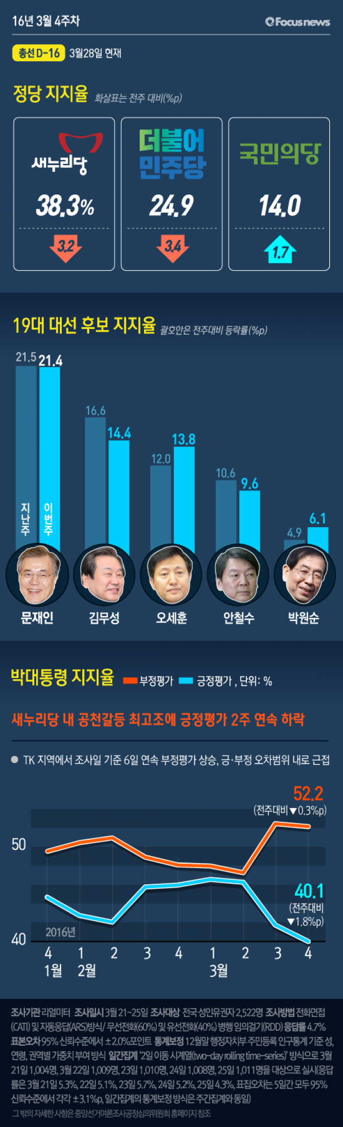 이번 주간집계는 2016년 3월 21일부터 25일까지 5일간 전국 19세 이상 유권자 2,522명을 대상으로 전화면접(CATI) 및 자동응답(ARS) 방식으로 무선전화(60%)와 유선전화(40%) 병행 임의걸기(RDD) 방법으로 조사했고, 응답률은 4.7%이다. 통계보정은 2015년 12월말 행정자치부 주민등록 인구통계 기준 성, 연령, 권역별 가중치 부여 방식으로 이루어졌고, 표집오차는 95% 신뢰수준에서 ±2.0%p이다. 일간집계는 ‘2일 이동 시계열(two-day rolling time-series)’ 방식으로 3월 21일 1,004명, 3월 22일 1,009명, 23일 1,010명, 24일 1,008명, 25일 1,011명을 대상으로 실시했고, 응답률은 3월 21일 5.3%, 22일 5.1%, 23일 5.7%, 24일 5.2%, 25일 4.3%, 표집오차는 5일간 모두 95% 신뢰수준에서 각각 ±3.1%p이다. 일간집계의 통계보정 방식은 주간집계와 동일하다.
