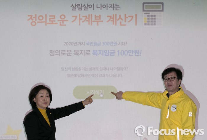 (서울=포커스뉴스) 심상정(왼쪽) 정의당 상임선대위원장과 천호선 공동선대위원장이 28일 오전 서울 여의도 국회에서 열린 중앙선대위 회의에 참석해 '정의로운 가계부' 소개 및 시연 행사 후 취재진을 향해 포즈를 취하고 있다.