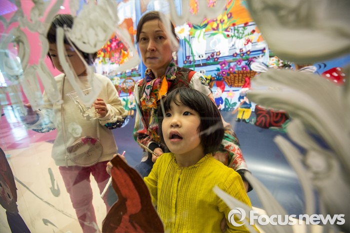 (서울=포커스뉴스) 28일 오전 서울 송파구 롯데백화점 잠실점 에비뉴엘 아트홀에서 열린 '러블리 레테' 전시회에서 프랑스 작가 나탈리 레테가 어린이들과 라이브페인팅을 하고 있다.