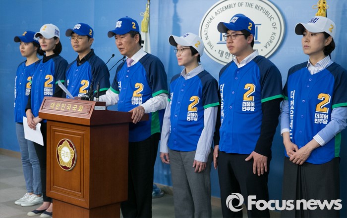 (서울=포커스뉴스) 더불어민주당에서 공천 탈락한 정청래, 김광진, 장하나 의원과 김빈 청년 비례대표 후보, 이동학 예비후보 등으로 구성된 '더컸유세단'이 28일 오전 서울 여의도 국회 정론관에서 출범 기자회견을 하고 있다.
