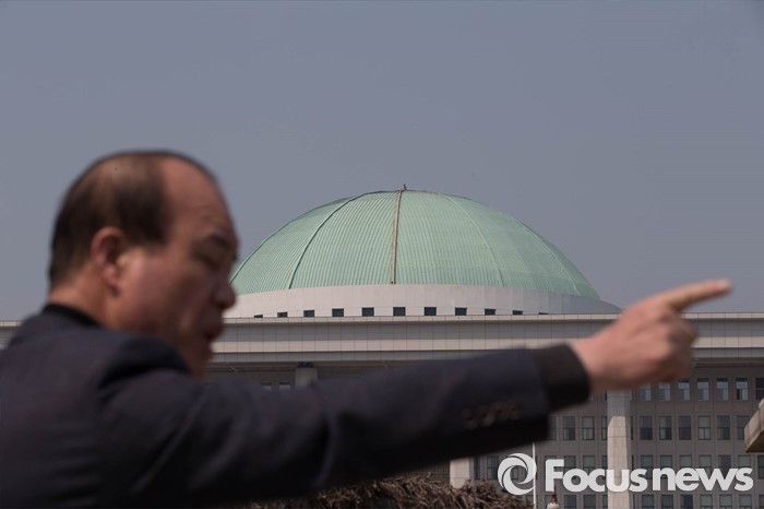 (서울=포커스뉴스) 28일 오후 서울 영등포구 국회 앞에서 대구 동구을 무공천 발표로 총선 출마가 좌절된 이재만 전 대구 동구청장의 지지자들이 김무성 새누리당 대표의 사퇴를 촉구하고 있다.