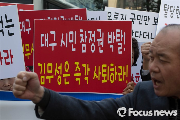 (서울=포커스뉴스) 28일 오후 서울 영등포구 새누리당 당사 앞에서 대구 동구을 무공천 발표로 총선 출마가 좌절된 이재만 전 대구 동구청장의 지지자들이 김무성 새누리당 대표의 사퇴를 촉구하고 있다.