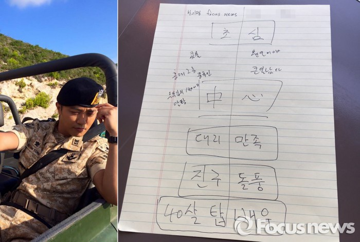 "지금 나는 성인 연기자이긴 하지만, 딱 중간 정도라 생각해요. 선배들도 있지만, 후배들도 많이 생겼죠. 가끔 '나 때문에 연기하게 됐다'는 후배들도 만나면 책임감이 무거워져요. 후배들을 보면서 초심을 되새기죠. '나도 저런 시절이 있었지'라는 생각이 들고요. 예전보다 배부르고 따뜻하고 사람들에게 인정받더라도 후배들이 있는 한 열심히 하겠다는 생각을 해요."배우 진구가 최근 서울 삼청동의 한 카페에서 진행된 인터뷰 중 직접 작성한 메모. 기자의 이름과 함께 핵심 단어들을 메모했다. 진구는 현재 KBS2 수목드라마 '태양의 후예'에 출연 중이다. 한지명 기자. star5425@focus.co.kr <사진출처=진구 페이스북>