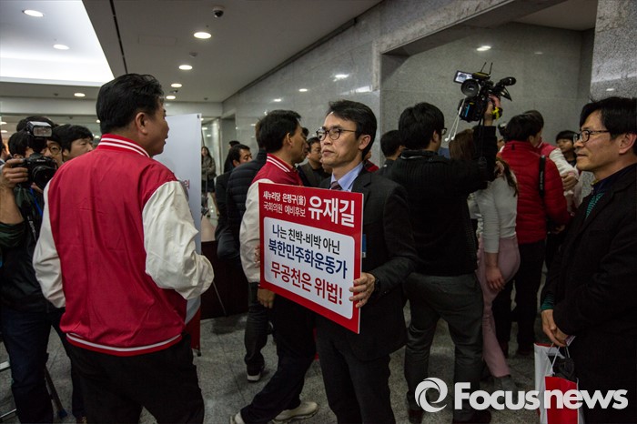 (서울=포커스뉴스) 새누리당의 무공천 결정으로 4.13 총선 서울 은평을 출마가 무산된 유재길 예비후보가 28일 오후 20대 총선 새누리당 공천자대회가 열리는 서울 영등포구 국회 의원회관에서 피켓 시위를 벌이고 있다.