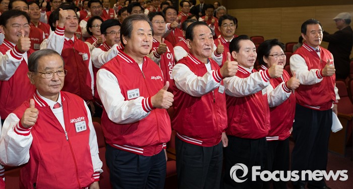 (서울=포커스뉴스) 28일 오후 서울 여의도 국회 의원회관 대회의실에서 열린 '제20대 총선 새누리당 공천자대회'에 참석한 김무성 새누리당 대표 등 당원들이 파이팅을 외치고 있다.