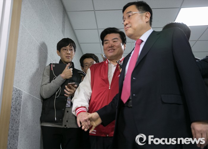 (서울=포커스뉴스) 원유철(왼쪽) 새누리당 원내대표와 김정훈 정책위의장이 28일 오후 서울 여의도 국회 의원회관에서 20대 총선 공천자대회에 앞서 진행된 비공개 최고위원회의에 참석하고 있다.
