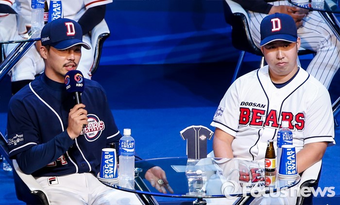 (서울=포커스뉴스) 28일 오후 서울 용산구 브루스퀘어 삼성카드홀에서 열린 '2016 타이어뱅크 프로야구 미디어데이 & 팬페스트' 행사에 참석한 두산 베어스 오재원 선수가 새 시즌에 임하는 각오를 밝히고 있다.