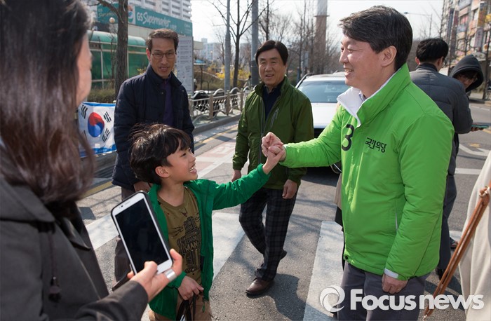 (서울=포커스뉴스) 20대 총선을 16일 앞둔 28일 오후 안철수 국민의당 서울 노원병 후보가 보람상가 앞에서 한 어린이와 손을 잡고 있다.