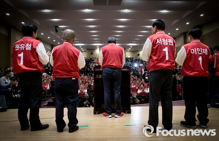 (서울=포커스뉴스) 28일 오후 서울 여의도 국회 의원회관에서 열린 새누리당 20대 총선 공천자대회에 참석한 원유철(왼쪽부터), 강봉균, 김무성, 서청원, 이인제 공동선대위원장이 인사말을 하고 있다.