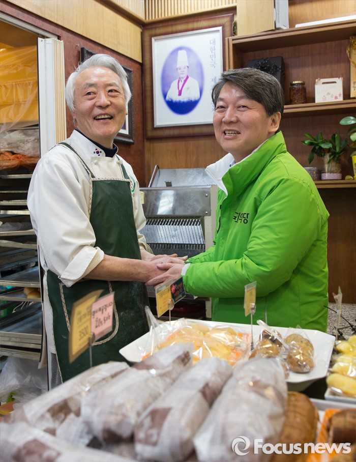 (서울=포커스뉴스) 20대 총선을 16일 앞둔 28일 오후 안철수 국민의당 서울 노원병 후보가 보람상가에서 제과점을 하는 상인과 인사하고 있다.