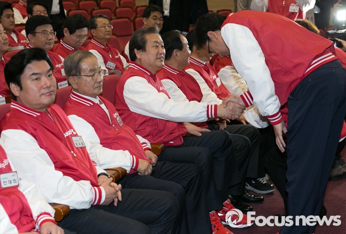 (서울=포커스뉴스) 28일 오후 서울 여의도 국회 의원회관에서 열린 새누리당 20대 총선 공천자대회에 참석한 김무성(왼쪽 세번째) 공동선대위원장과 한 후보가 인사하고 있다.
