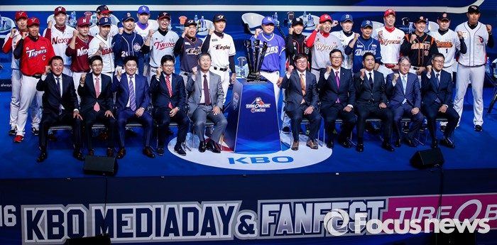 (서울=포커스뉴스) 28일 오후 서울 용산구 브루스퀘어 삼성카드홀에서 열린 '2016 타이어뱅크 프로야구 미디어데이 & 팬페스트' 행사에 참석한 10개 구단 감독 및 선수들이 기념촬영을 갖고 있다.