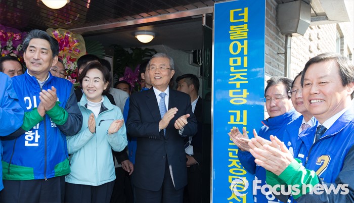 (괴산=포커스뉴스) 김종인 더불어민주당 비상대책위 대표가 28일 오후 충북 괴산군 정당선거사무소에서 열린 20대 총선 충북 후보 연석회의를 마치고 선거사무소 현판 제막식을 갖고 있다.