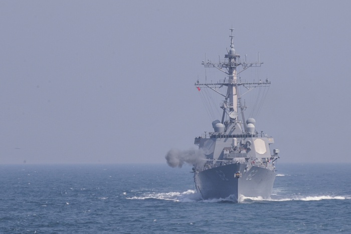 (서울=포커스뉴스) 제1회 서해 수호의 날인 25일 서해에서 열린 한·미 연합훈련에 참가한 미 이지스구축함 피츠제럴드함이 5인치 함포사격을 하고 있다. <사진제공=해군>