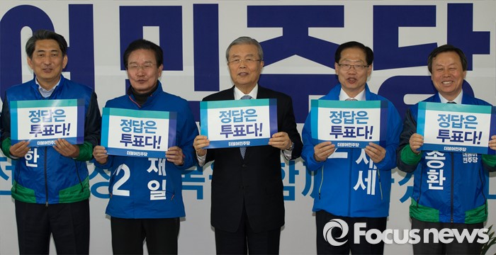 (괴산=포커스뉴스) 김종인 더불어민주당 비상대책위 대표가 28일 오후 충북 괴산군 정당선거사무소에서 열린 20대 총선 충북 후보 연석회의에서 충북지역 후보자들과 필승을 다짐하고 있다.