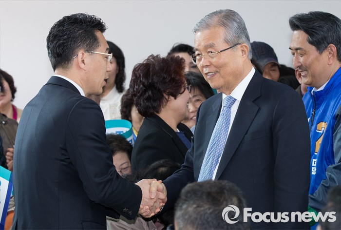(괴산=포커스뉴스) 김종인 더불어민주당 비상대책위 대표가 28일 오후 충북 괴산군 정당선거사무소에서 열린 20대 총선 충북 후보 연석회의에 입장하며 당원들과 악수를하고 하고 있다.