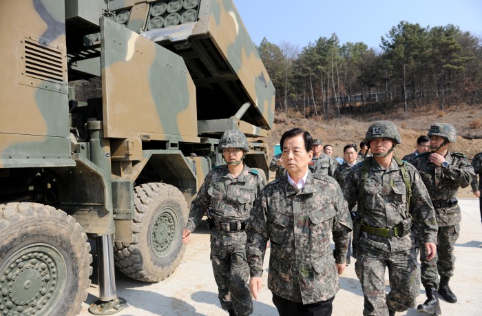 (서울=포커스뉴스) 최근 북한의 대남위협이 연일 계속되는 가운데 한민구 국방부 장관이 28일 적의 도발 위협에 대비해 최전방 천무(다련장) 대대를 방문, 대비태세를 확인하고 장병들을 격려했다.