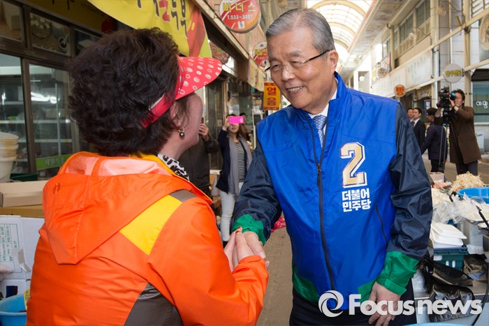 (진천=포커스뉴스) 김종인 더불어민주당 비상대책위 대표가 28일 오후 충북 진천군 중앙시장을 방문, 시민들과 인사를 하고 있다.