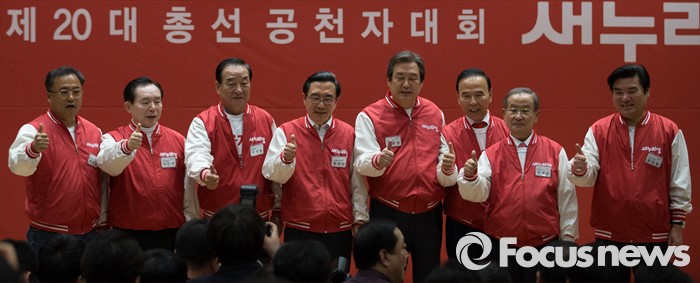 (서울=포커스뉴스) 28일 오후 서울 여의도 국회 의원회관에서 열린 새누리당 20대 총선 공천자대회에 참석한 충북 지역 후보들과 지도부가 기념촬영을 하고 있다.