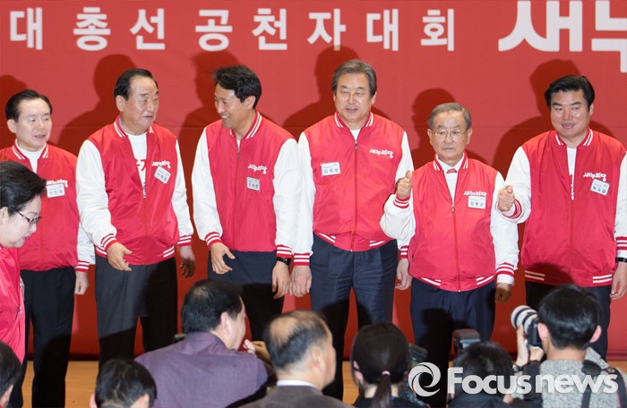 (서울=포커스뉴스) 28일 오후 서울 여의도 국회 의원회관에서 열린 새누리당 20대 총선 공천자대회에 참석한 오세훈 서울 종로구 후보와 공동선대위원장이 기념촬영을 하고 있다. 오른쪽부터 원유철, 강봉균, 김무성 위원장, 오 후보, 서청원, 이인제 위원장.