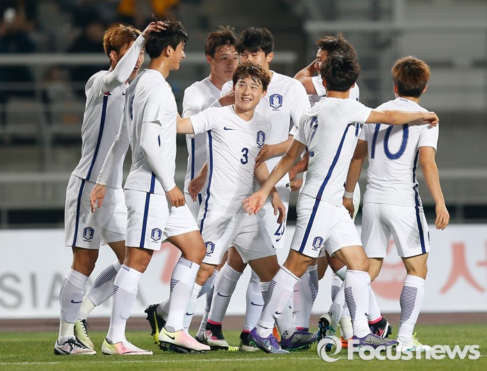 (고양=포커스뉴스) 28일 오후 경기 고양종합운동장에서 열린 올림픽축구대표팀 2차 평가전 대한민국과 알제리의 경기에서 한국 이창민이 전반전 선제골을 넣고 동료선수들과 환호하고 있다.