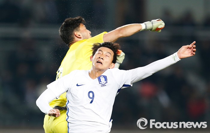 (고양=포커스뉴스) 28일 오후 경기 고양종합운동장에서 열린 올림픽축구대표팀 2차 평가전 대한민국과 알제리의 경기에서 한국 김현이 알제리 골키퍼 파리드 칼을 피해 헤딩슛을 하고 있다.