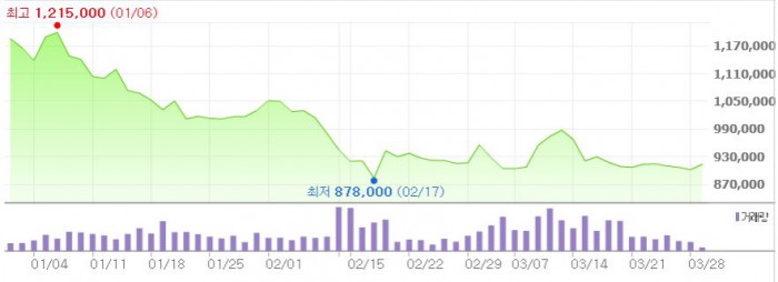그는 "중국도 업황은 그리 우호적이지 않다"면서도 "오리온의 경우 지난해 하반기의 제품 확장 효과, 원가 합리화에 따른 매출총이익률 개선, 수익성 높은 전통채널 비중의 확대에 기반해 이익 성장이 지속되고 있다"고 진단했다.최근 3개월간 오리온 주가 추이 <그래픽출처=네이버>