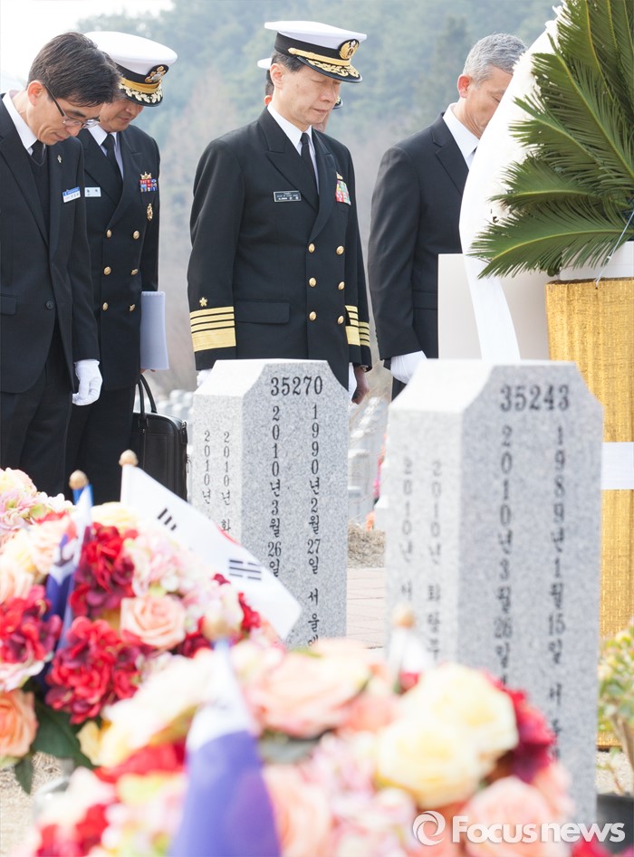 (대전=포커스뉴스) 다케이 도모히사 일본 해상막료장(해군참모총장)이 29일 오전 대전 유성구 국립대전현충원을 방문, 천안함 46용사 묘역을 찾아 참배하고 있다.