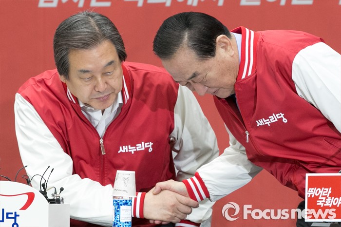 (서울=포커스뉴스) 김무성(왼쪽) 새누리당 대표와 서청원 최고위원이 29일 오전 서울 여의도 국회에서 열린 첫 중앙선거대책위원회의에 참석해, 악수하고 있다.