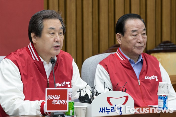 (서울=포커스뉴스) 김무성(왼쪽) 새누리당 대표가 29일 오전 서울 여의도 국회에서 열린 첫 중앙선거대책위원회의에 참석해, 모두발언하고 있다.