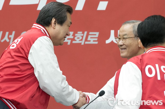(서울=포커스뉴스) 김무성(왼쪽) 새누리당 대표가 29일 오전 서울 여의도 국회에서 열린 첫 중앙선거대책위원회의에 참석해, 강봉균 공동 선대위원장과 악수하고 있다.
