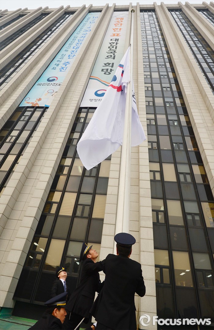 (서울=포커스뉴스) 29일 오전 서울 종로구 정부서울청사에서 대한민국 정부기 게양식이 열렸다. 이날 행사에 참석한 정부 관계자들이 새 태극 도안 정부기를 게양하고 있다. 정부는 67년간 사용해온 '무궁화'에서 '태극' 도안으로 바뀐 새 정부기를 정부세종청사와 서울청사 등 10개 청사에 게양했다.