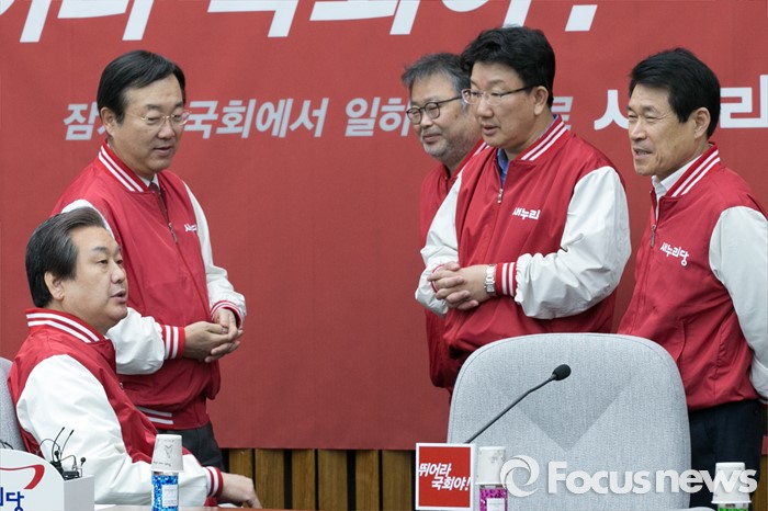 (서울=포커스뉴스) 김무성(앞줄 왼쪽) 새누리당 대표가 29일 오전 서울 여의도 국회에서 열린 첫 중앙선거대책위원회의에 참석해, 의원들과 대화하고 있다.