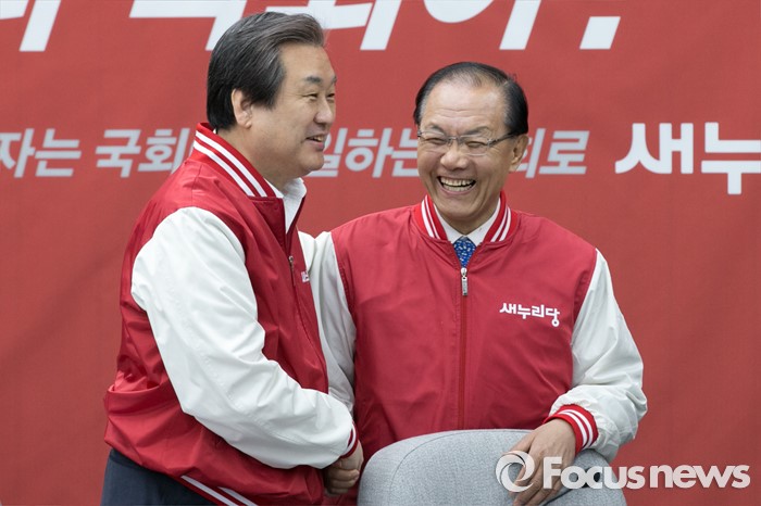 (서울=포커스뉴스) 김무성(왼쪽) 새누리당 대표가 29일 오전 서울 여의도 국회에서 열린 첫 중앙선거대책위원회의에 참석해, 황우여 의원과 악수하고 있다.