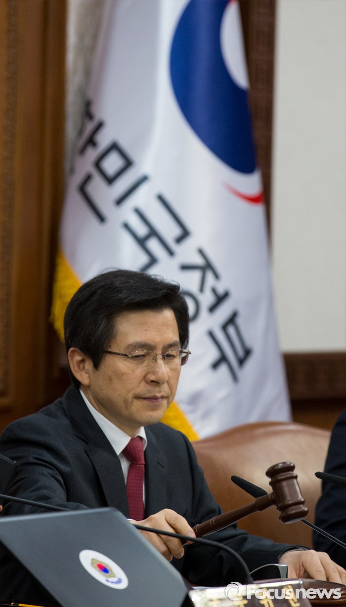 (서울=포커스뉴스) 29일 오전 서울 종로구 정부서울청사에서 열린 국무회의에 참석한황교안 국무총리가 의사봉을 두드리고 있다. 뒤로는 이날 새롭세 바뀐된 태극 도안의 새 정부기.
