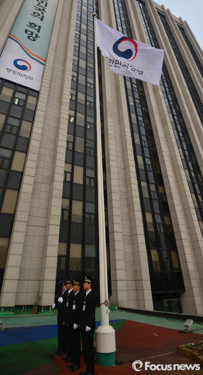 (서울=포커스뉴스) 29일 오전 서울 종로구 정부서울청사에서 대한민국 정부기 게양식이 열렸다. 이날 행사에 참석한 정부 관계자들이 새 태극 도안 정부기를 게양하고 있다. 정부는 67년간 사용해온 '무궁화'에서 '태극' 도안으로 바뀐 새 정부기를 정부세종청사와 서울청사 등 10개 청사에 게양했다.