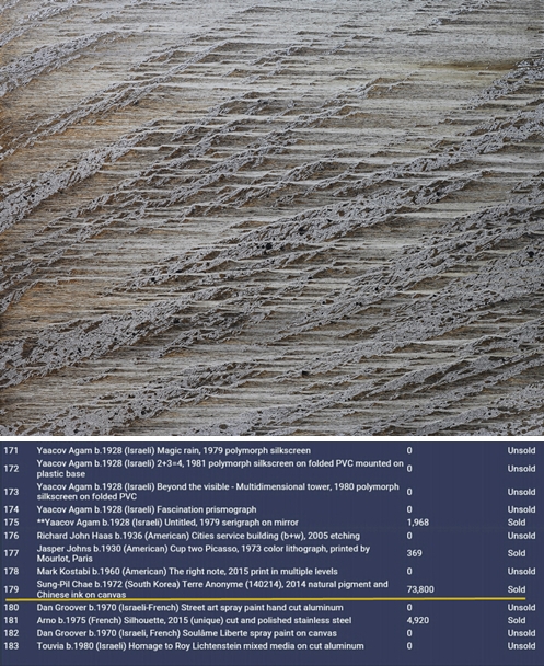 류병학 미술평론가는 "채성필 작가의 작품이 질적 평가를 받았다는 것과 앞으로 본격적으로 국제미술시장에서 회자될 것이라는 일종의 '신호탄'이라고 할 수 있을 것 같다"며 "세계 미술품 경매시장을 좌지우지 하고 있는 유대인들의 본거지 예루살렘에서 첫 경매로 낙찰된 것은 한국 미술계의 희소식"이라고 평가했다.지난 16일 미술품 경매사이트 '마츠아트 옥셔니어스 앤 어프레이저스'에서 거래된 채성필 작가의 '익명의 땅'(위쪽)과 '마츠아트 옥셔니어스 앤 어프레이저스' 경매에서 거래된 작품 리스트.<사진출처=마츠아트 옥셔니어스 앤 어프레이저스>