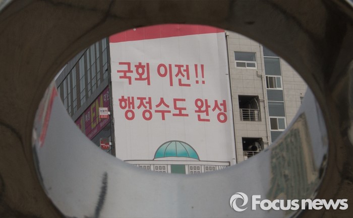 (세종=포커스뉴스) 29일 오전 세종시 국회의원 후보 선거사무소 외벽에 '국회이전, 행정수도 완성'이라는 공약이 적힌 현수막이 걸려있다.