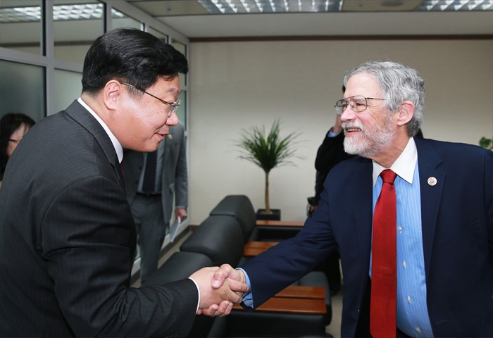 (서울=포커스뉴스) 주형환 산업통상자원부 장관은 29일 오후 서울 종로구 정부서울청사 외교부 집무실에서 ‘한미 과학기술협력 공동위원회’에 참석하기 위해 방한중인 존 홀드렌 (John P. Holdren) 미국 백악관 과학기술정책실장(장관급)과 면담에 앞서 악수를 하고 있다. <사진제공=산업통상자원부>