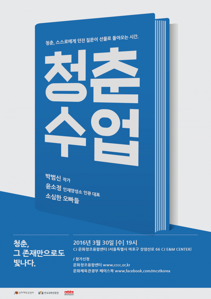문화체육관광부는 29일 "서울 마포구 CJ 문화창조융합센터에서 한국국학진흥원과 함께 토크콘서트 '청춘수업'을 연다"고 밝혔다.