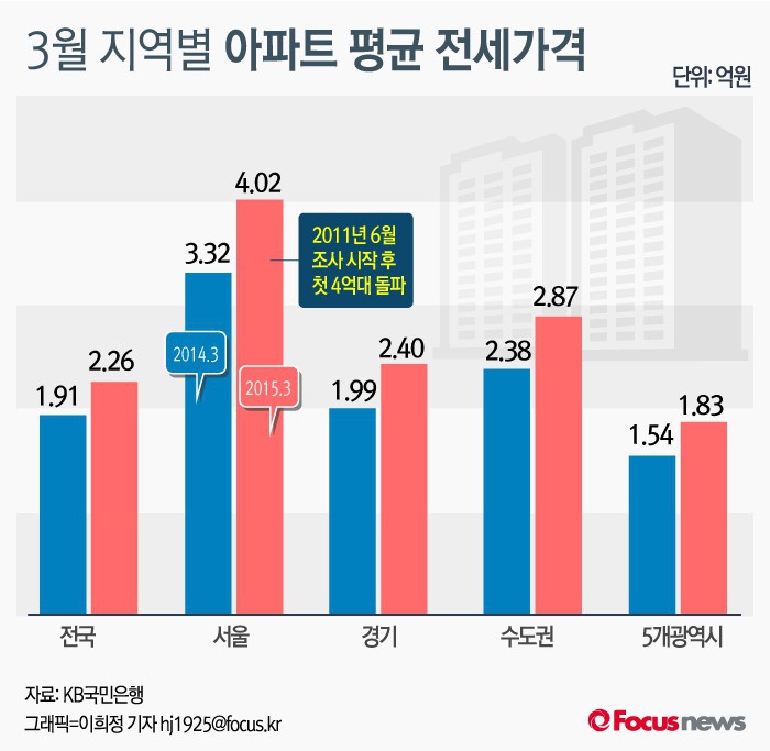 (서울=포커스뉴스) 29일 KB국민은행이 발표한 ‘3월 전국 주택가격 동향 조사결과’에 따르면, 3월말 서울 아파트의 평균 전세금은 4억244만원으로 나타났다. 아파트 평균 전세금이 4억원을 돌파한 건 관련 조사를 시작한 2011년 6월 이후 처음이다.